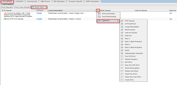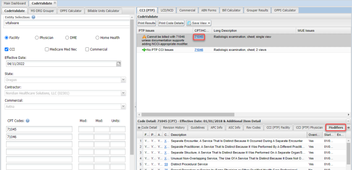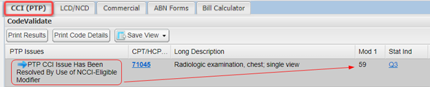 The CCI tab provides information on any CCI issues found based on the CPT/HCPCS codes you entered. It will also validate that the Modifiers used are best practice and will alleviate the CCI issues.
