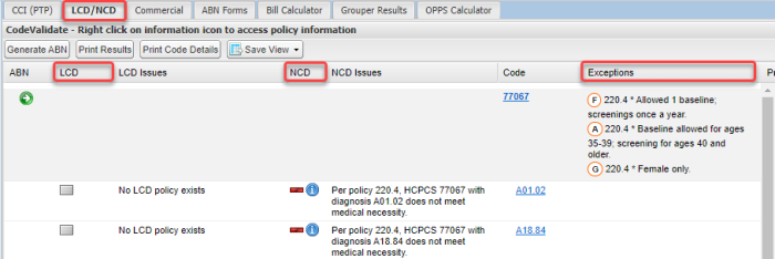 The LCD/NCD tab provides information on Local and National Coverage Determinations found based on the CPT and Diagnosis codes you entered.