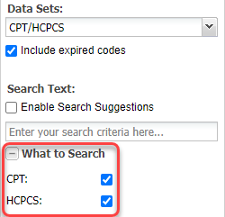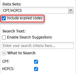 For CPT/HCPCS, you can exclude expired codes by clearing the box. By default, expired codes are included in the search.