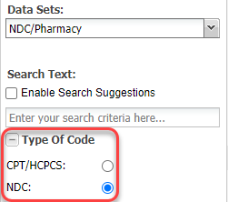 The NDC/Pharmacy data set Type of Code filter allows filtering for either NDC or CPT/HCPCS codes. The default uses NDC codes.