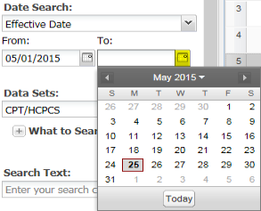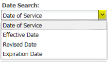 The Date Search defaults to the current date as the Date of Service. All information in your search results apply to the date of service chosen. The other filter options are Effective Date, Revised Date, and Expiration Date.